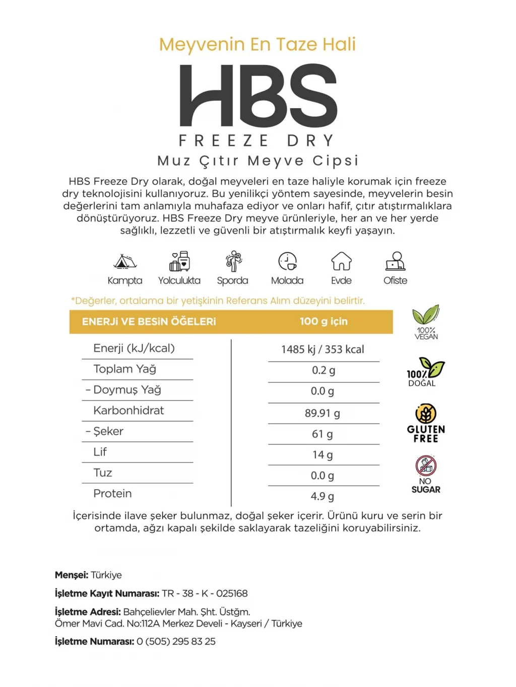 - Besin Değerleri Korunmuş: Freeze-dry yöntemiyle muzların potasyum, lif ve vitamin içeriği korunarak sağlıklı bir atıştırmalık sunar.