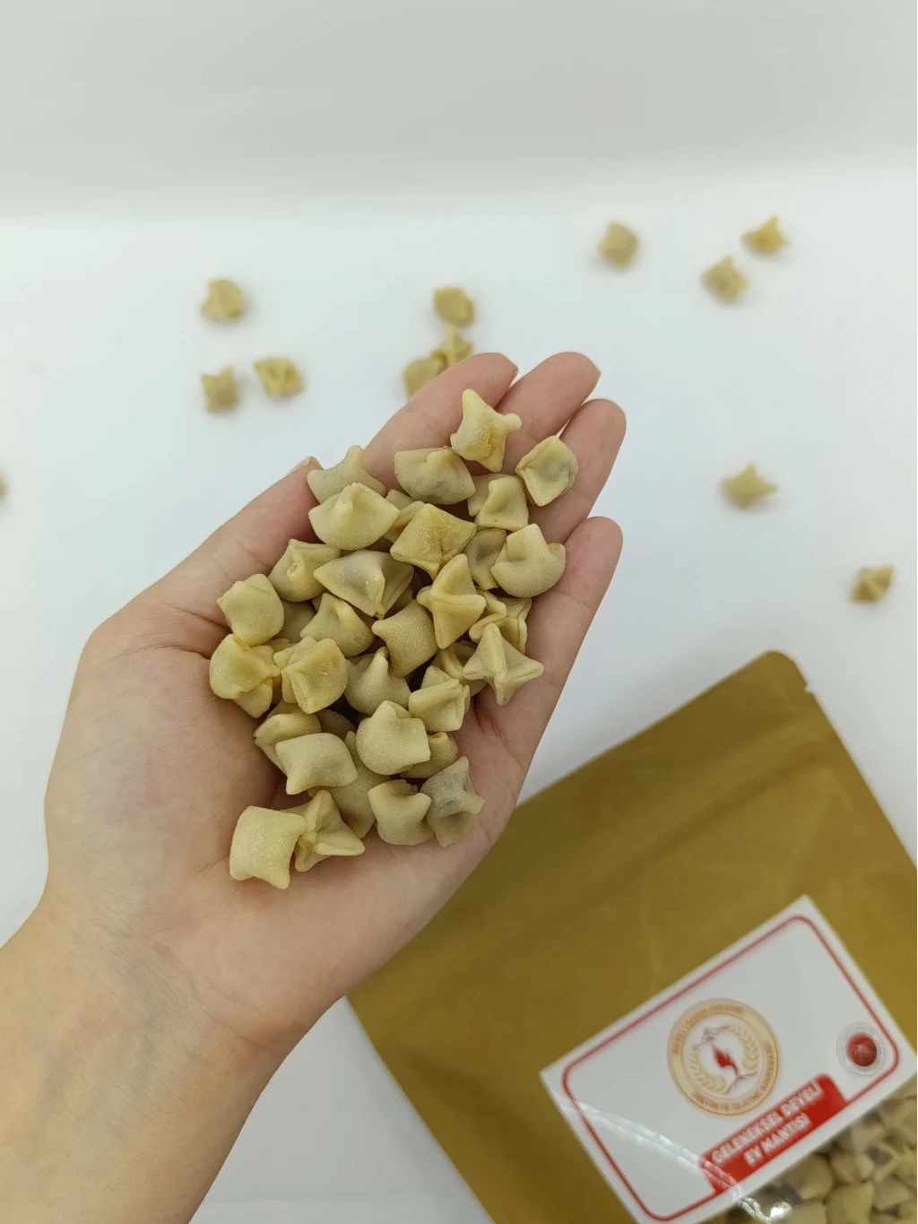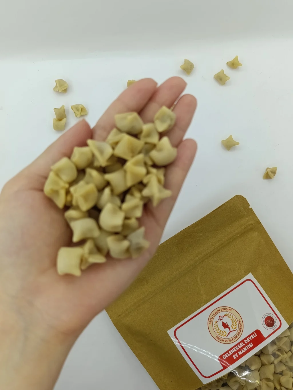 Mantı hamuru geleneksel yöntemlerle hazırlanır ve ince şekilde açılır. Hazırlanan dana etli iç harç küçük hamur parçalarının içerisine eklenir ve mantılar tek tek kapatılarak mantı formu verilir.
