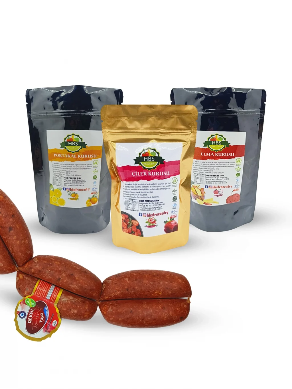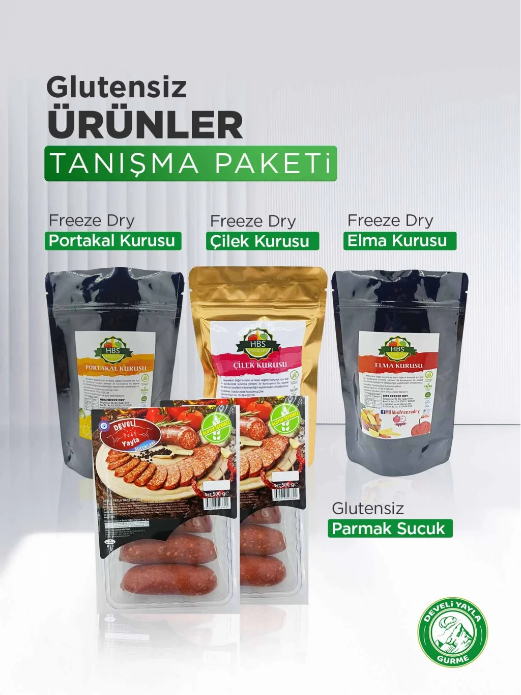 Glutensiz bir yaşam tarzını benimseyenler için özel olarak hazırlanmış bir pakettir. Bu paket, sağlıklı ve doğal içerikleriyle öne çıkan dört farklı ürünü bir araya getiriyor: freeze-dry çilek, elma, portakal ve 500 gr glutensiz sucuk.
